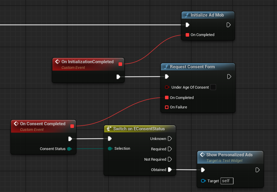 In this example, AdMob is initialized first, followed by a consent form request using the Request Consent Form node. Once initialization is completed, the consent dialog is shown to the user, allowing them to choose whether they agree to receive personalized ads in accordance with GDPR and COPPA.