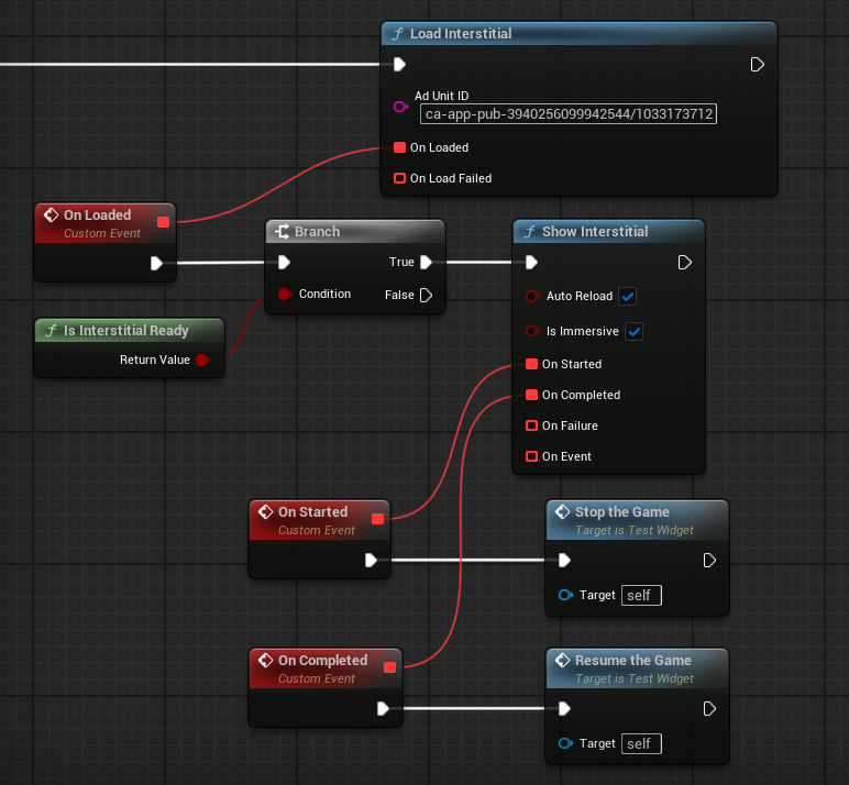 Once the loading process finishes, the On Loaded event is triggered. The graph then checks whether the interstitial is ready with Is Interstitial Ready. If the ad is ready, the Show Interstitial node is executed.