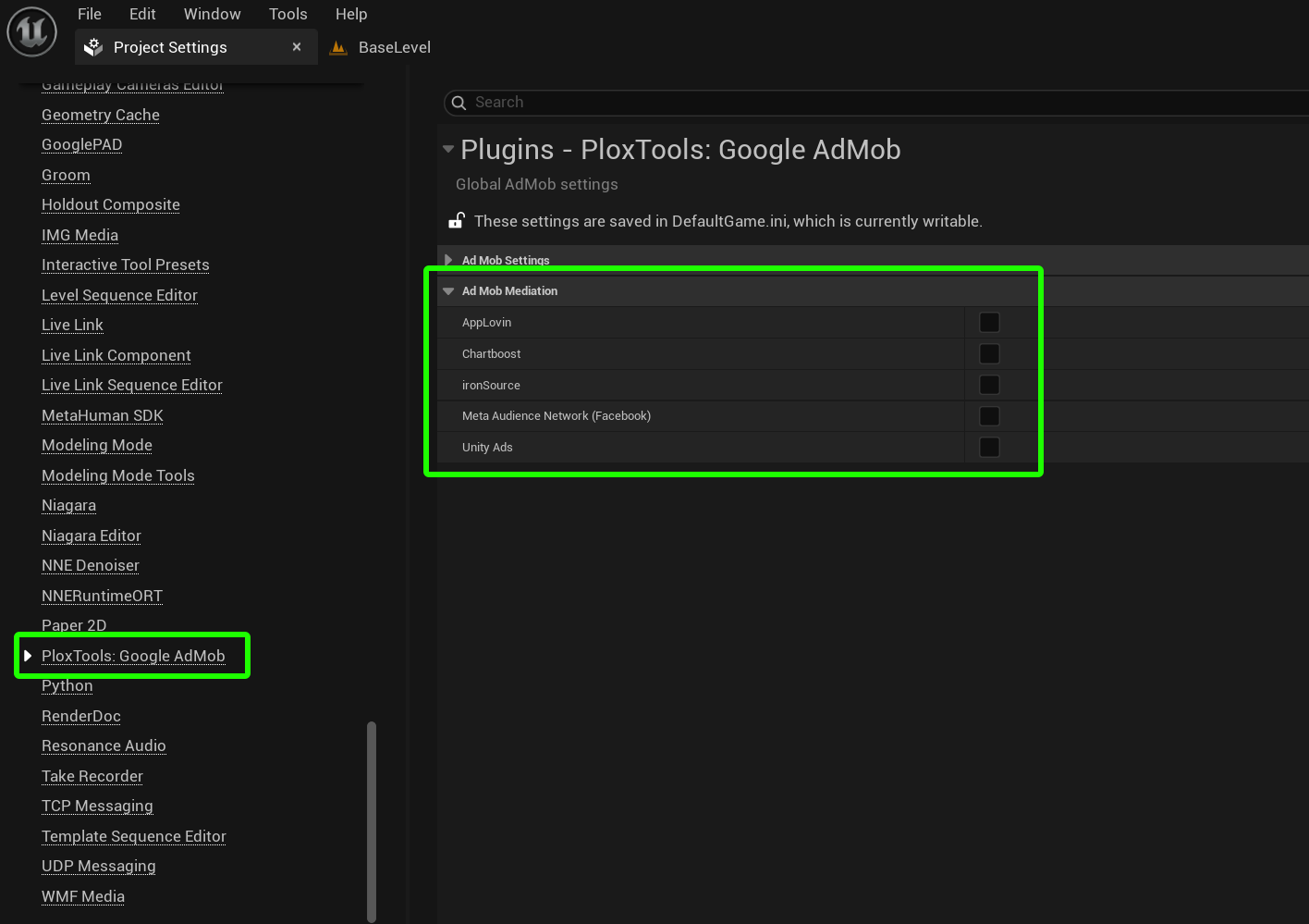Project Settings → Plugins → PloxTools: Google AdMob → Ad Mob Mediation