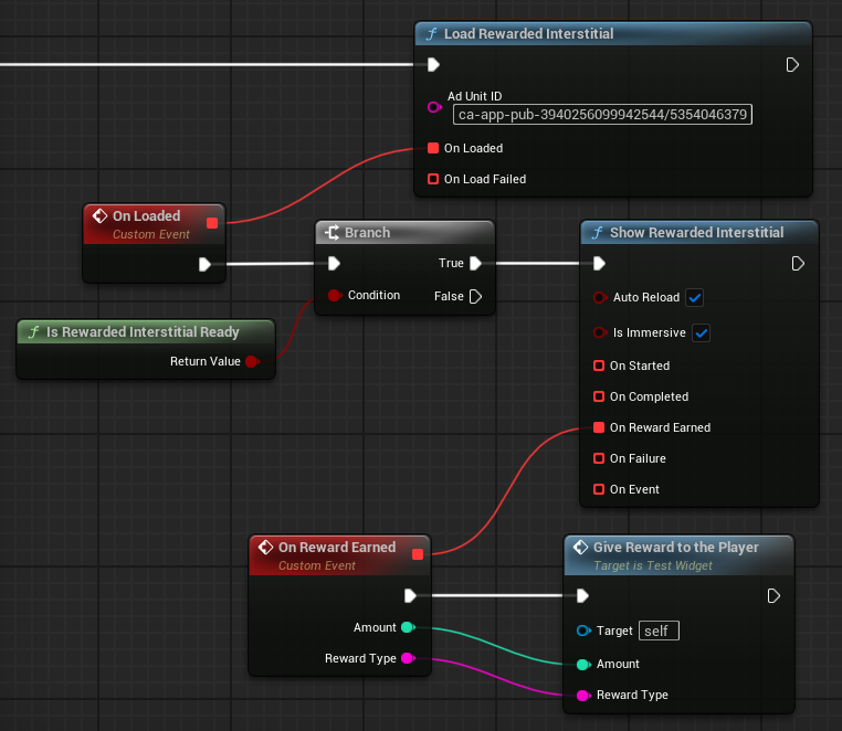 In this example, the Load Rewarded Interstitial function requests a rewarded interstitial ad using the official Google test ad unit ca-app-pub-3940256099942544/5354046379.