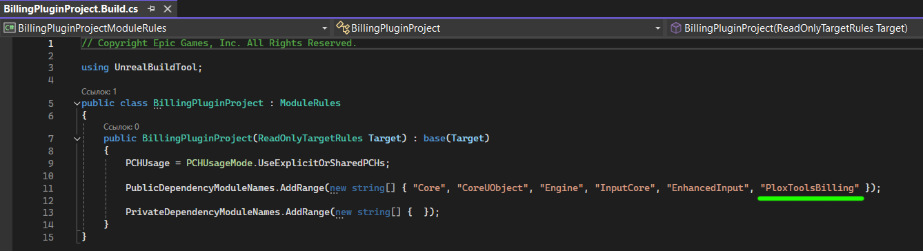 Open your project’s *.Build.cs file and add "PloxToolsBilling" to the public dependency modules list: