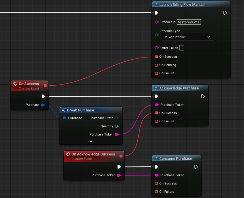 In this example, we handle a purchase manually using Launch Billing Flow Manual. After the player successfully completes a purchase, the returned FPurchase struct is broken down to extract the Purchase Token. That token is then used to explicitly call Acknowledge Purchase and, after acknowledgment succeeds, Consume Purchase to reset the product for repurchase.