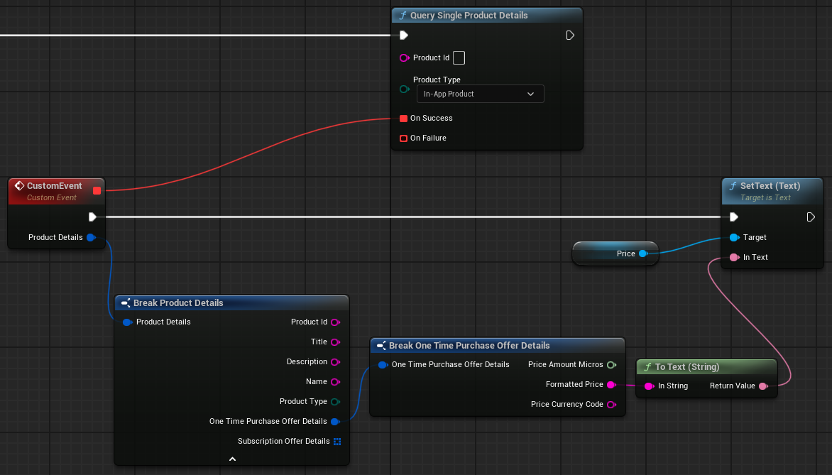 In this example, the Query Single Product Details node requests detailed information for a specific in-app product from the Google Play Console. When the query succeeds, the returned Product Details struct is passed to a Custom Event, where its fields are accessed using the Break Product Details node.