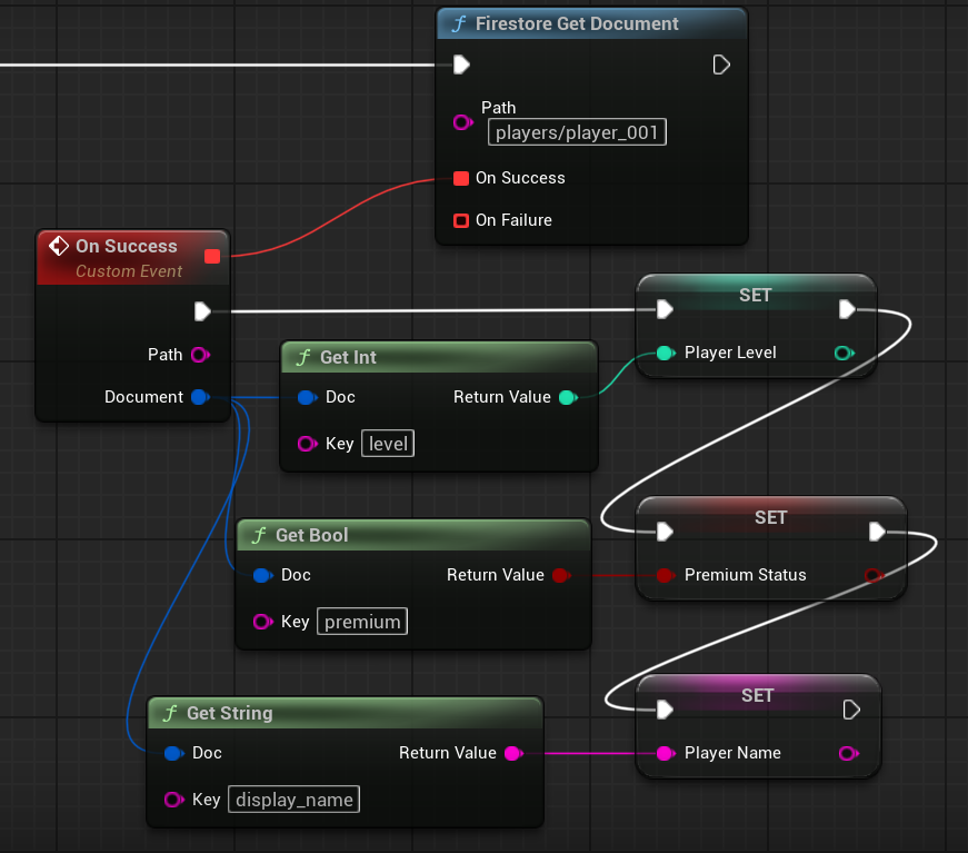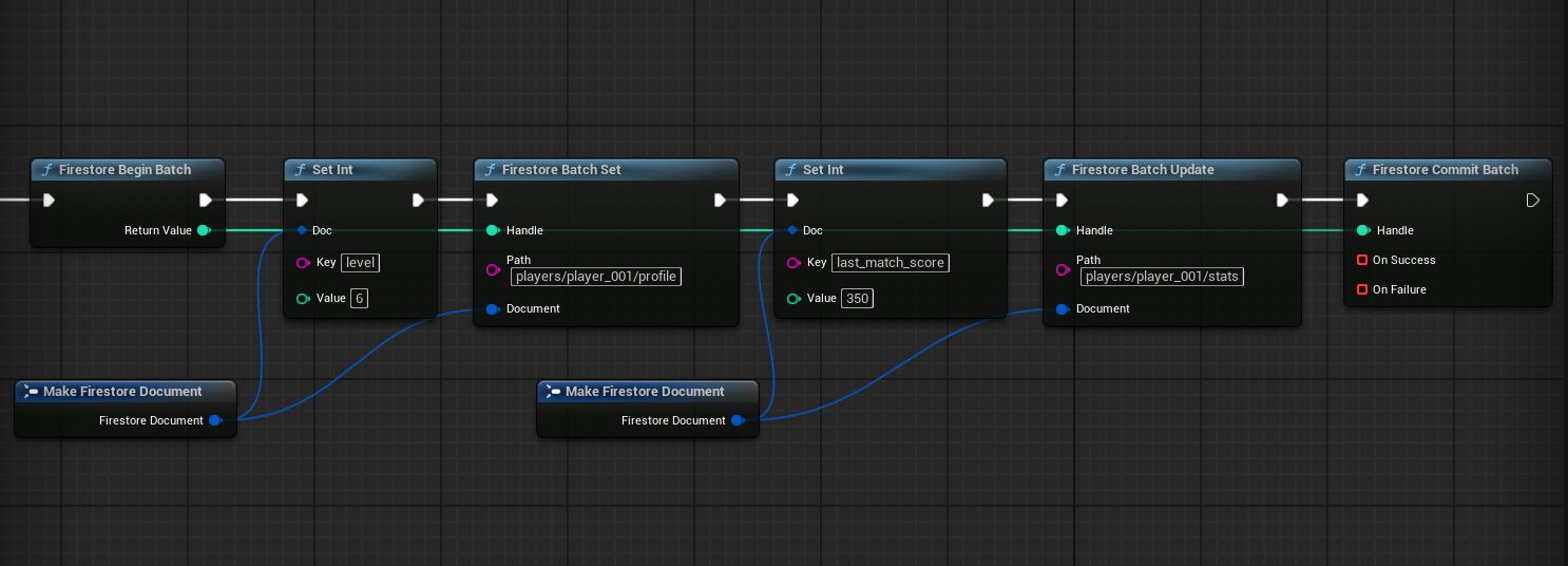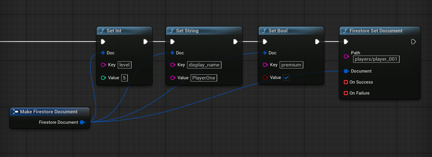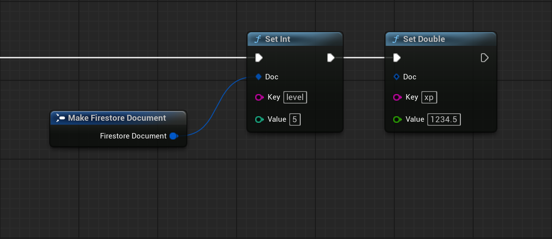 - FirestoreDocument is used as the main data container when calling Firestore operations (Set, Update, Add, Batch, etc.). Simple fields (int, string, bool, double) are typically added to the document directly using document setter nodes
