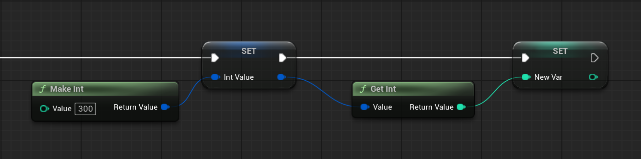 - extract individual fields using typed getter nodes (Get Int, Get String, Get Bool, etc.)