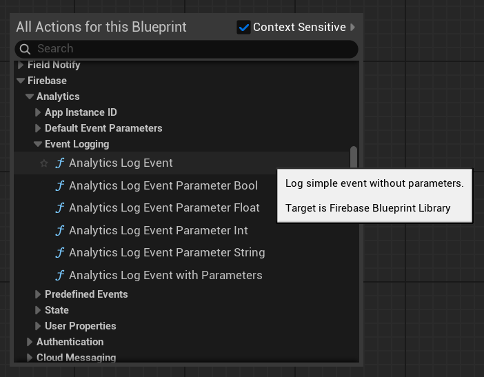 Once the plugin is enabled, all available Firebase functions become accessible directly in Blueprints. Each Firebase service is exposed under its own subcategory.