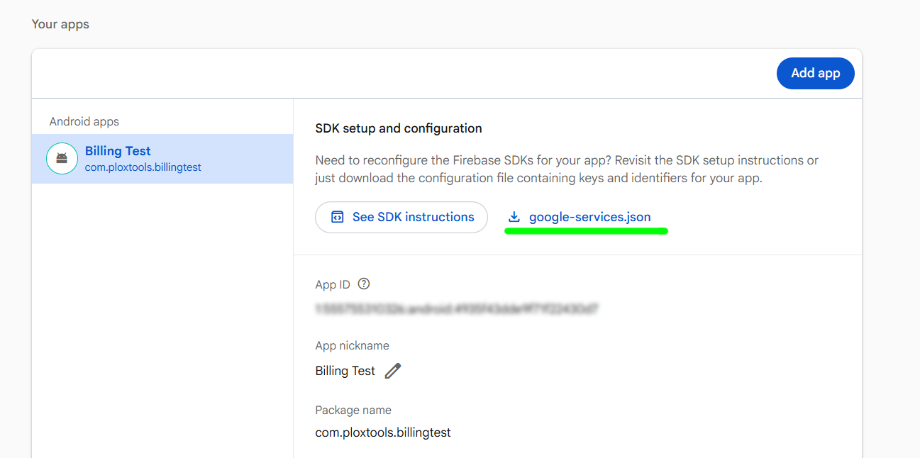 - In the Firebase Console, open your project and click Add app, then select Android.