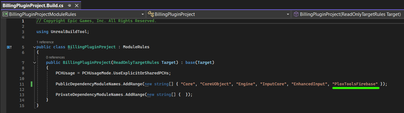 Open your project’s *.Build.cs file and add "PloxToolsFirebase" to the public dependency modules list:
