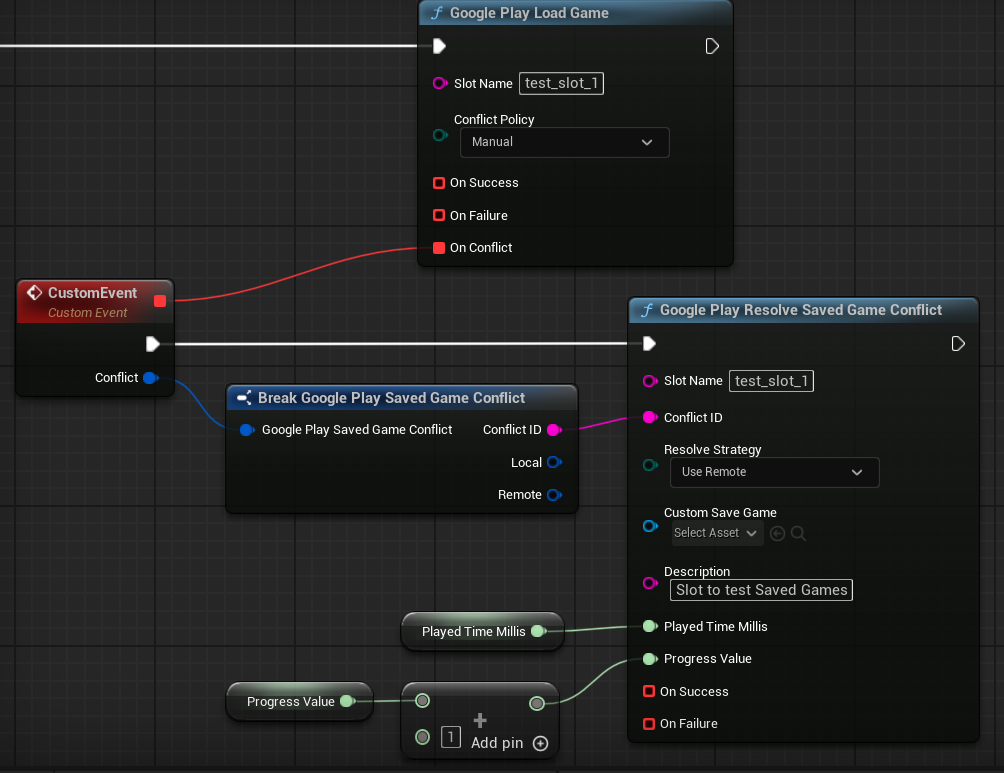If a conflict occurs, On Conflict is triggered and returns an FGooglePlaySavedGameConflict structure.