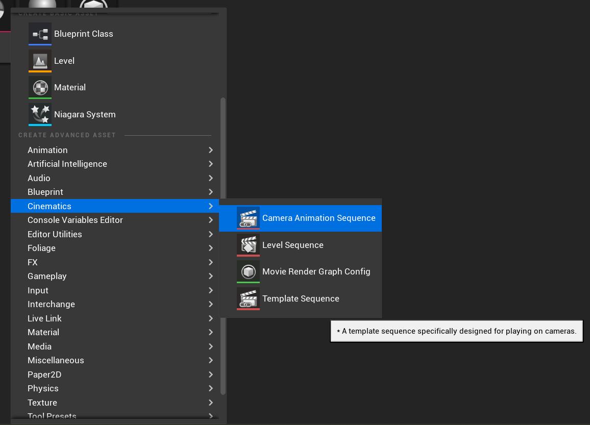 - Navigate to Cinematics → Camera Animation Sequence