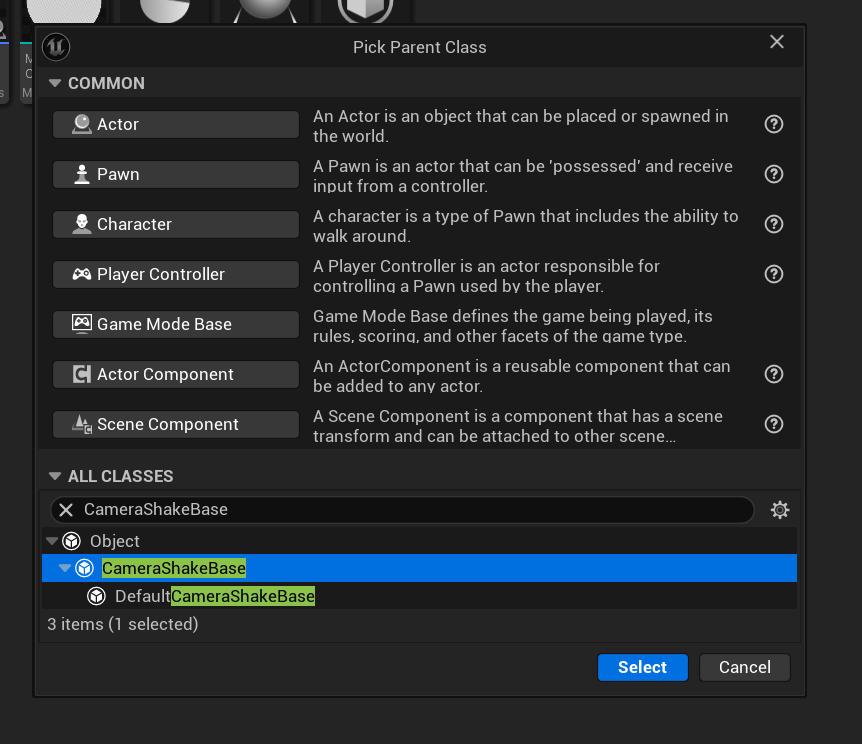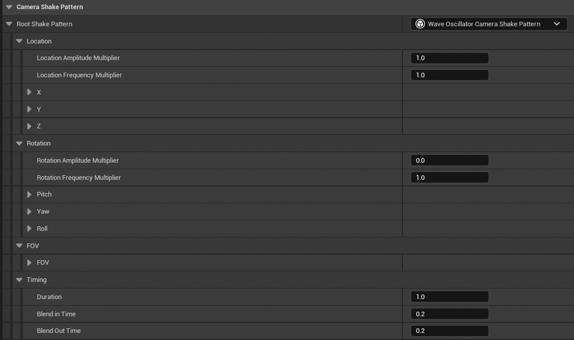 Camera Shakes use Unreal Engine’s built-in CameraShakeBase system.