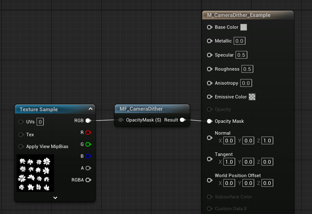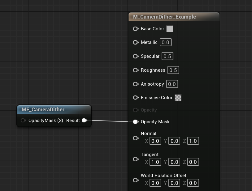 Drag MF_CameraDithering into the material graph and connect it to: