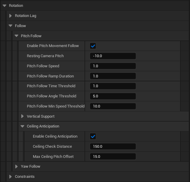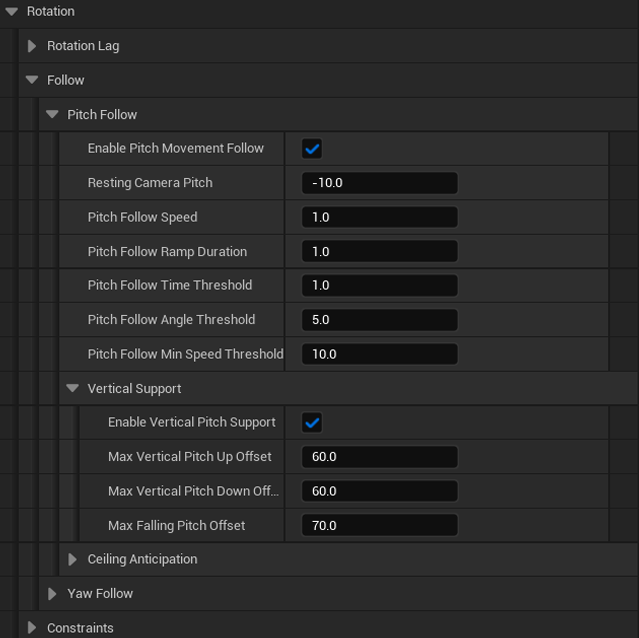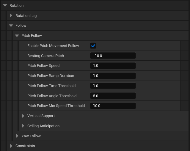 - Rotation Lag Speed - how fast the camera catches up to the target rotation