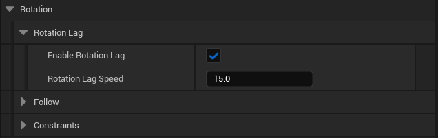 Rotation Lag smooths camera rotation by interpolating toward the target rotation instead of snapping instantly.