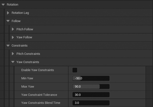 Yaw Constraints limit horizontal camera rotation relative to the current orientation.