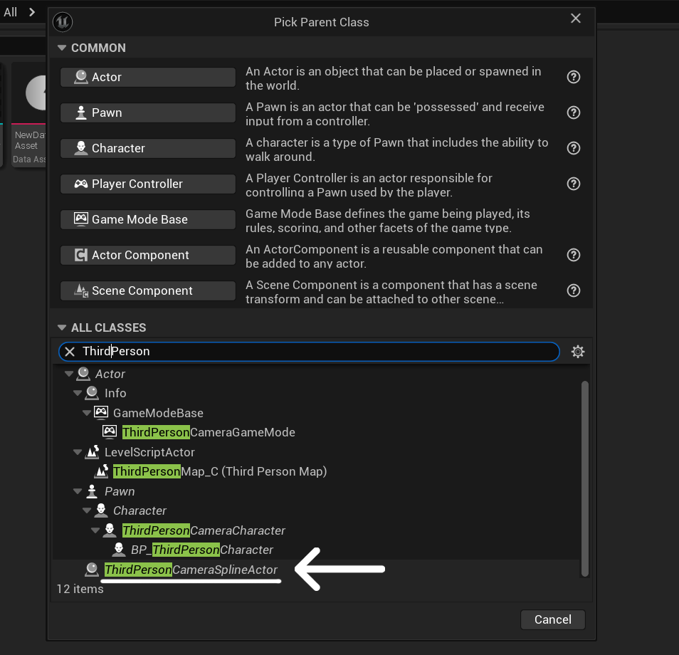 The spline camera is based on a dedicated Actor: ThirdPersonCameraSplineActor.