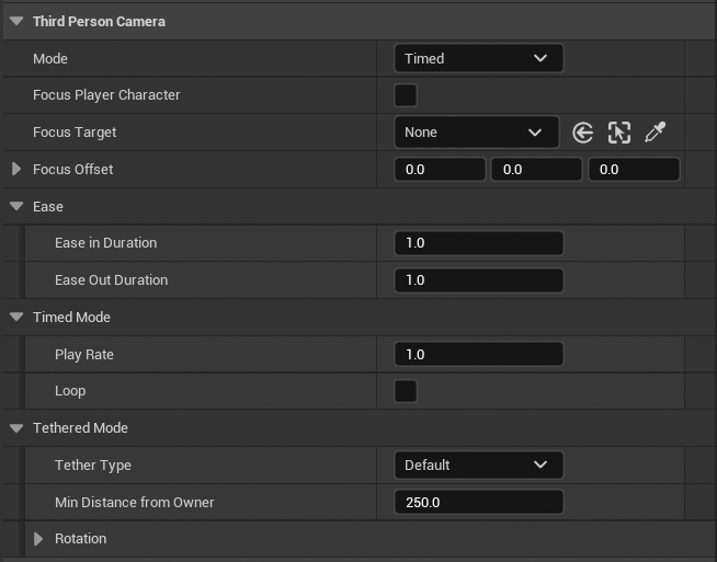 After setting up and playing a spline, these options allow you to control how the camera moves, follows targets, and blends with gameplay.