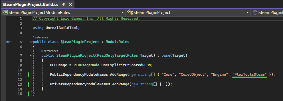 Open your project’s *.Build.cs file and add "PloxToolsSteam" to the public dependency modules list: