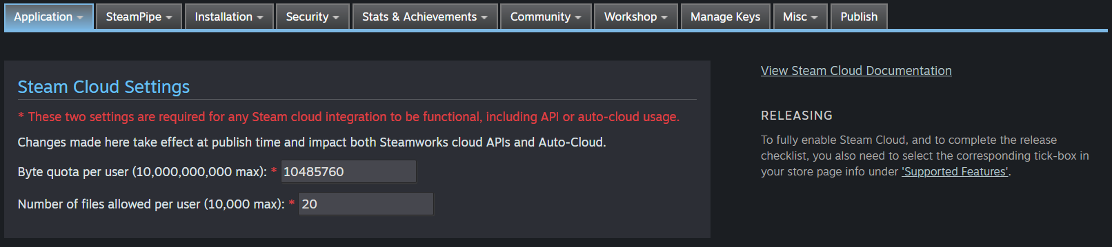 This section explains how to configure Steam Cloud in Steamworks so it can be used by the Steam Cloud subsystem for saving and loading user data.