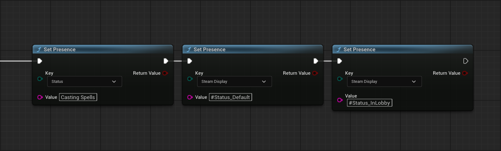 Statuspresence key is set to a dynamic value (Casting Spells) steam_displayis set to#Status_Default, which uses the placeholder-based layoutsteam_displayis then updated to#Status_InLobby, switching the Rich Presence layout